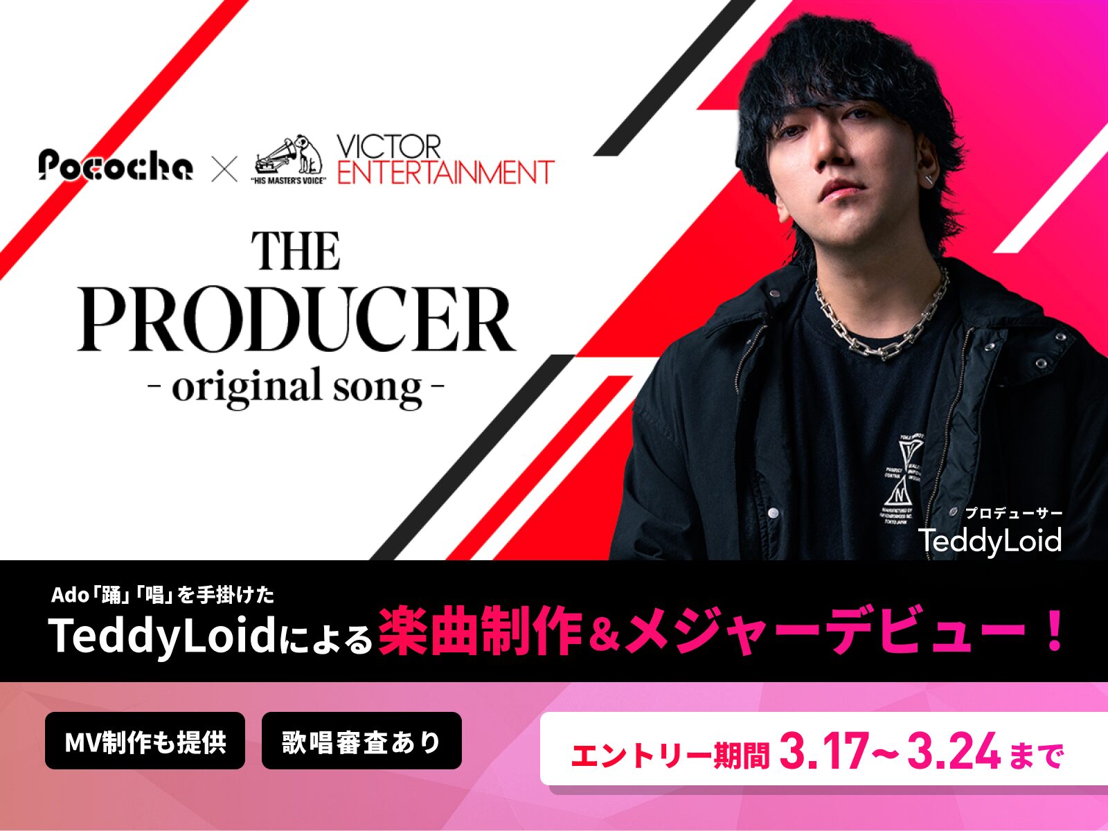 本イベントは、数々のトップアーティストを輩出してきたビクターエンタテインメントの協力のもと実施する、Pocochaとしては初の楽曲制作イベントだ。1位のライバーには、Adoの「踊」「唱」などを手掛ける世界的プロデューサー・TeddyLoid氏がオリジナル楽曲を書き下ろし、ビクターエンタテインメントよりメジャー配信リリースされる。さらに特典として、楽曲の世界観を表現するミュージックビデオの制作も提供。音源と映像の両面から、ライバーの才能を多角的にプロデュースする内容となっている。