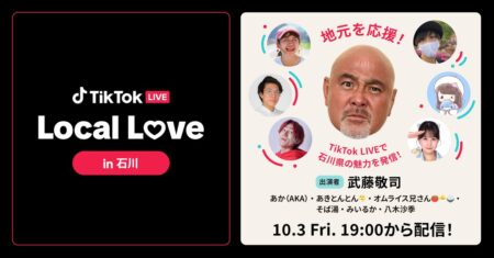 ニュース TikTok、石川県観光大使で元プロレスラーの武藤敬司さんと人気TikTokクリエイターらが出演する「TikTok LIVE Local Love in 石川」を10/3に開催!2025/09/24 20:13