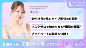 - 自分自身の活躍の場や可能性を広げることができるライブ配信とbuzzliveさんに出会えたおかげで毎日がとても充実しています。 マンツーマンでマネージャーの方とやりとりできて常に手厚いサポートをしてくださるのとオフ会を企画したりもしてくださるので皆んなで仲良く初心者の方も安心して活動できる環境が整っています!(まみお)