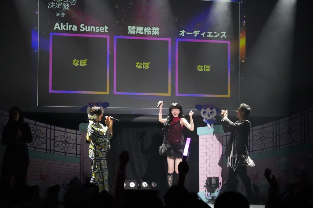 イベントの目玉である『ボーカル王者決定戦』には、予選を勝ち抜いたVライバーを含む16名が登場。決勝の3枠をかけ、多種多様な歌声とパフォーマンスを繰り広げた。審査はゲスト審査員の鷲尾伶菜、Akira Sunsetに加え、会場の観客による投票も行われ、まさに会場一体となって勝者を決定する形式だ。