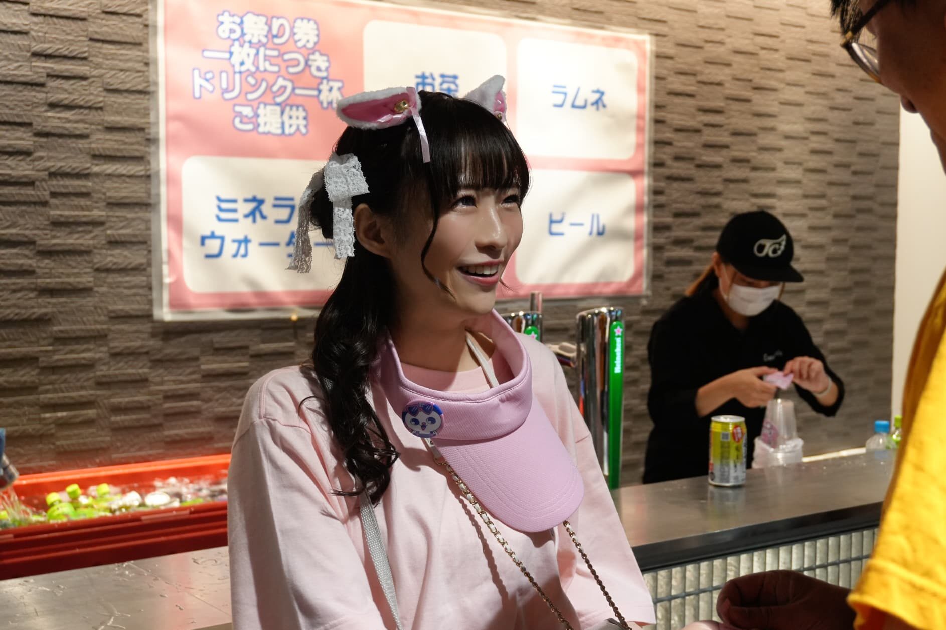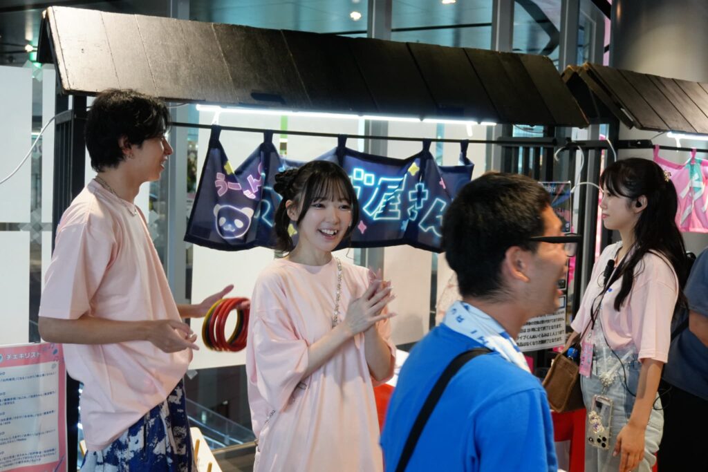会場のホワイエは、開演前から文化祭さながらの熱気に包まれていた。フロアにはミニステージに加え、屋台がずらりと立ち並び、焼きそばやフランクフルトといったフードメニューに加え、輪投げや射的なども楽しめる。ライバー自身が店頭に立ち、ビールの売り子販売も大盛況。多くのファンで賑わい、歩くのもままならないほどの活気で、ステージが始まる前から存分に楽しめる空間が広がっていた。