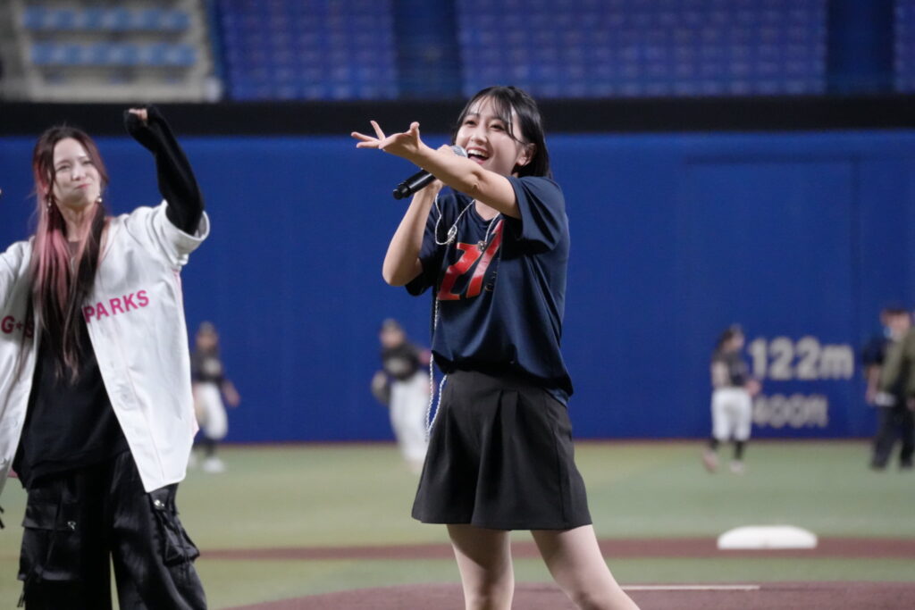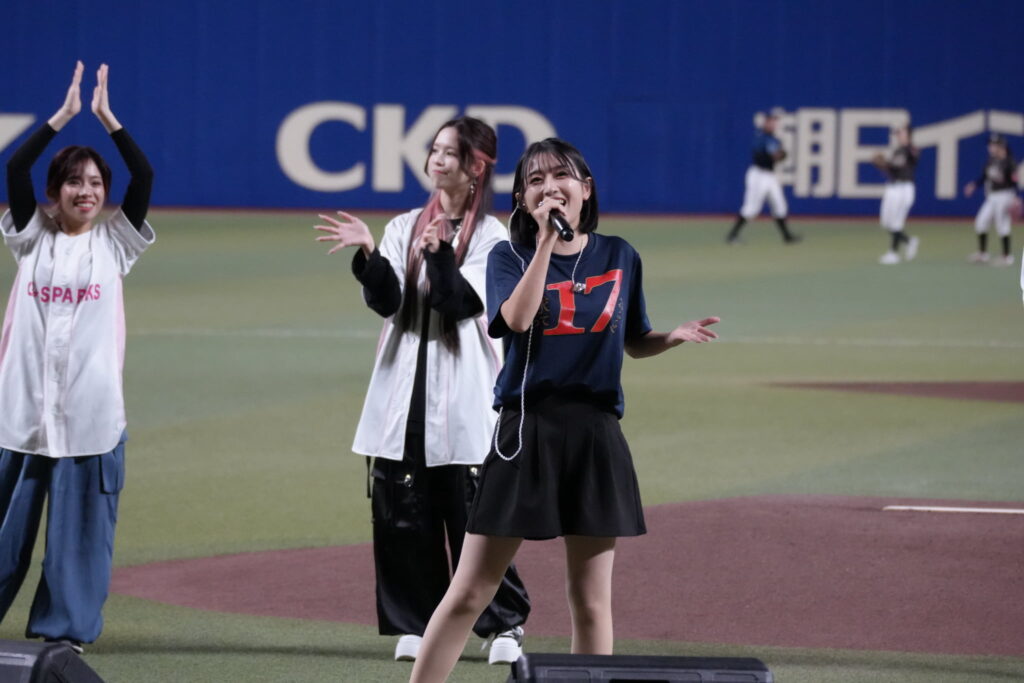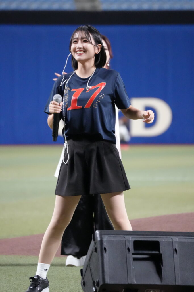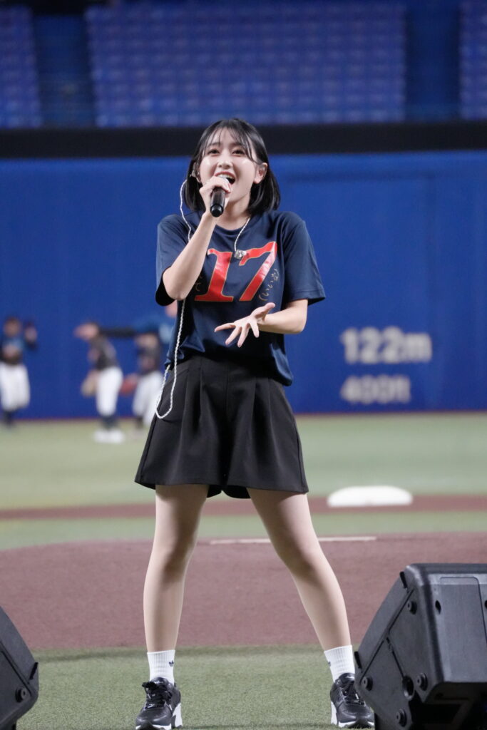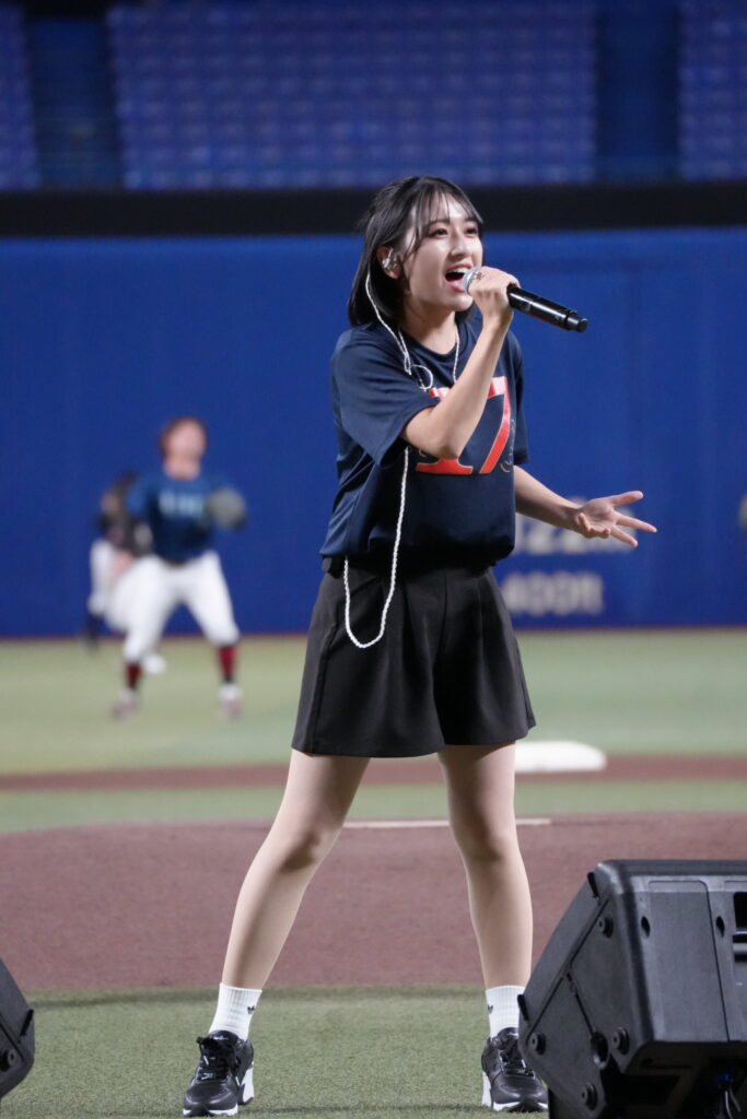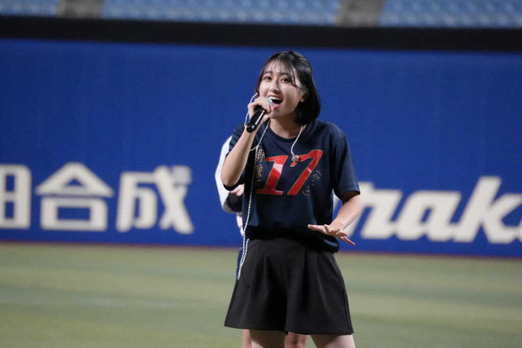 試合開始に先立ち行われたオープニングセレモニーでは、大会スポンサーである17LIVEから2組のライバーがグラウンドに登場。THREE GONGのメインテーマソングをイチナナライバーのmikeが、そして17LIVE野球応援プロジェクト「野球って17(いいな)」のテーマソングを福Pro_穂乃香が熱唱した。