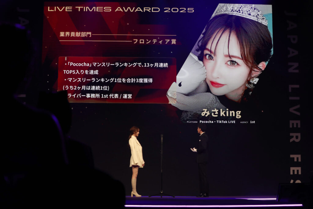 11月14日(金)、東京都内会場で業界初となるライブ配信プラットフォームの垣根を超えた祭典「JAPAN LIVER FESTIVAL 2025」が開催された。様々なプラットフォームで活躍する人気ライバー、クリエイターが招待され、「LIVE TIMES AWARD 2025」の授賞式をはじめ、リアルイベントや企業とのコラボレーション企画など、多彩なコンテンツが展開された歴史的なイベントとなった。ライブ配信アプリPocochaで長年トップライバーとして活躍した後、現在はライバー事務所の運営に注力するみさkingは業界貢献部門においてフロンティア賞を受賞した。