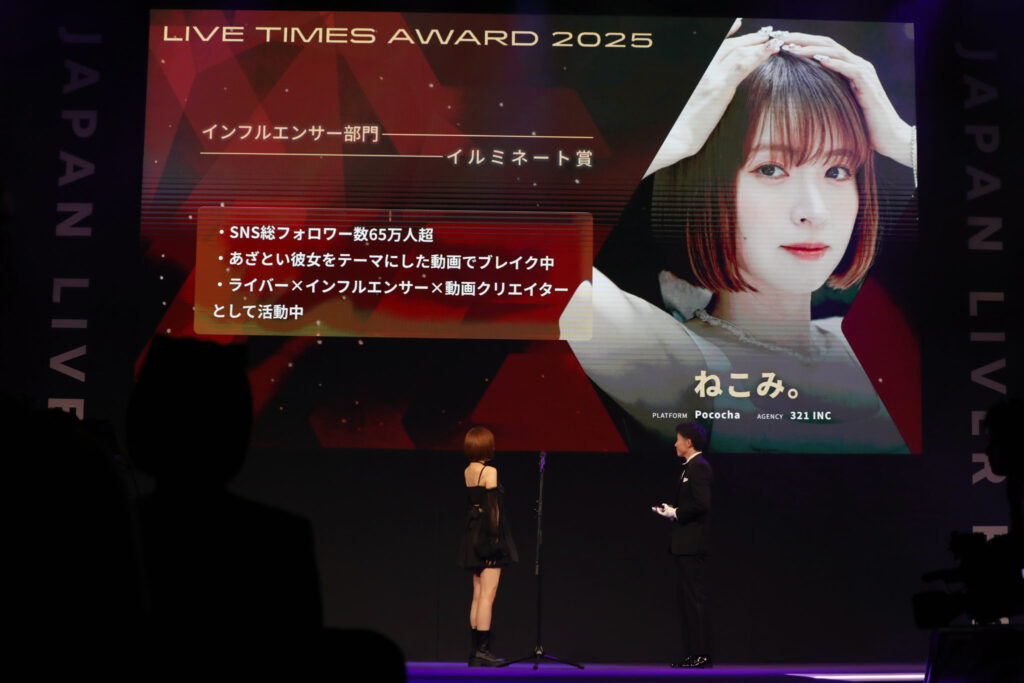 11月14日(金)、東京都内会場で業界初となるライブ配信プラットフォームの垣根を超えた祭典「JAPAN LIVER FESTIVAL 2025」が開催された。様々なプラットフォームで活躍する人気ライバー、クリエイターが招待され、「LIVE TIMES AWARD 2025」の授賞式をはじめ、リアルイベントや企業コラボレーション企画など、多彩なコンテンツが展開された歴史的なイベントとなった。ライブ配信やSNSで多くの人の心を惹きつけてきた人気ライバーねこみ。はインフルエンサー部門においてイルミネート賞を受賞した。