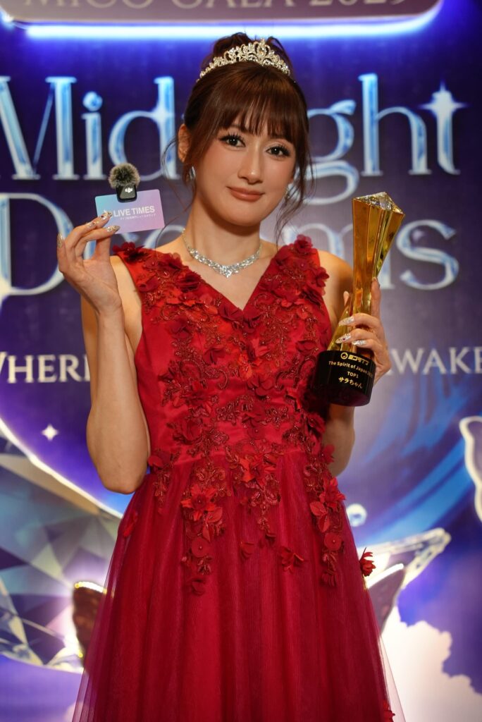 授賞式に登壇したサラは、鮮やかな真紅のロングドレスで登場。頭にはティアラが輝き、1位のトロフィーを手に、「日本一」にふさわしい堂々とした存在感を放っていた。