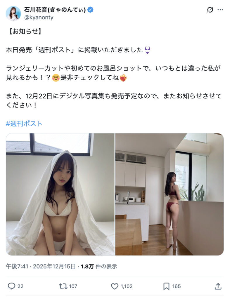 投稿では続けて、「ランジェリーカットや初めてのお風呂ショットで、いつもとは違った私が見れるかも!?」と見どころにも言及。加えて「12月22日にデジタル写真集も発売予定なので、またお知らせさせてください!」と、今後のリリース予定も明かし、期待を高めた。