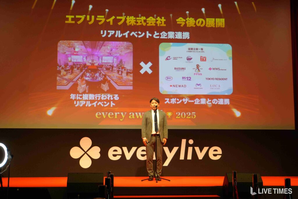 everyliveについては、モデル・音楽・お笑いに加え、2026年は声優部門や学生向けの新部門を立ち上げる計画も明かされた。リアルイベントとして「every-1 グランプリ 2026」がすでにスタートしており、「every sonic」の開催も予定。スポンサー企業との連携を強化し、アプリ内イベント・リアルイベント双方の拡充を図っていくという。
