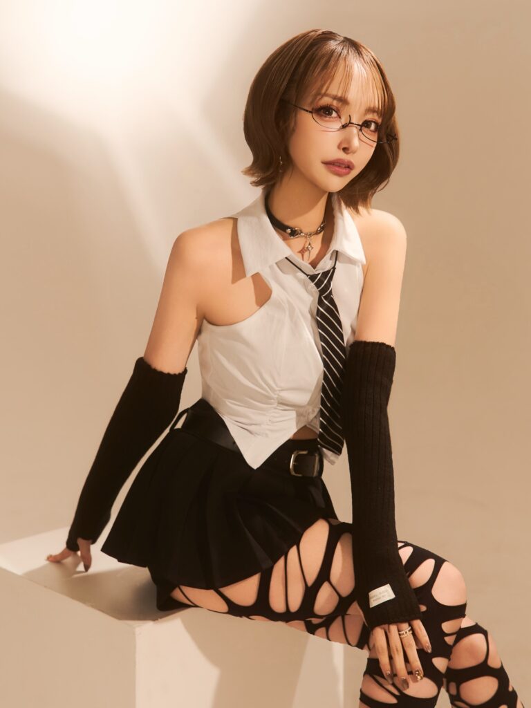 投稿は2件にわたり、計4枚の写真を披露。同じコスチュームながら、ポージングや目線のニュアンスを変えたショットが並んでいる。大胆なカットが施された白のノースリーブシャツにストライプネクタイ、黒のプリーツミニスカートを合わせた大人セクシーなスタイリングで、惜しげもなく見せる美肌と抜群のスタイルがファンの視線を釘付けにしている。