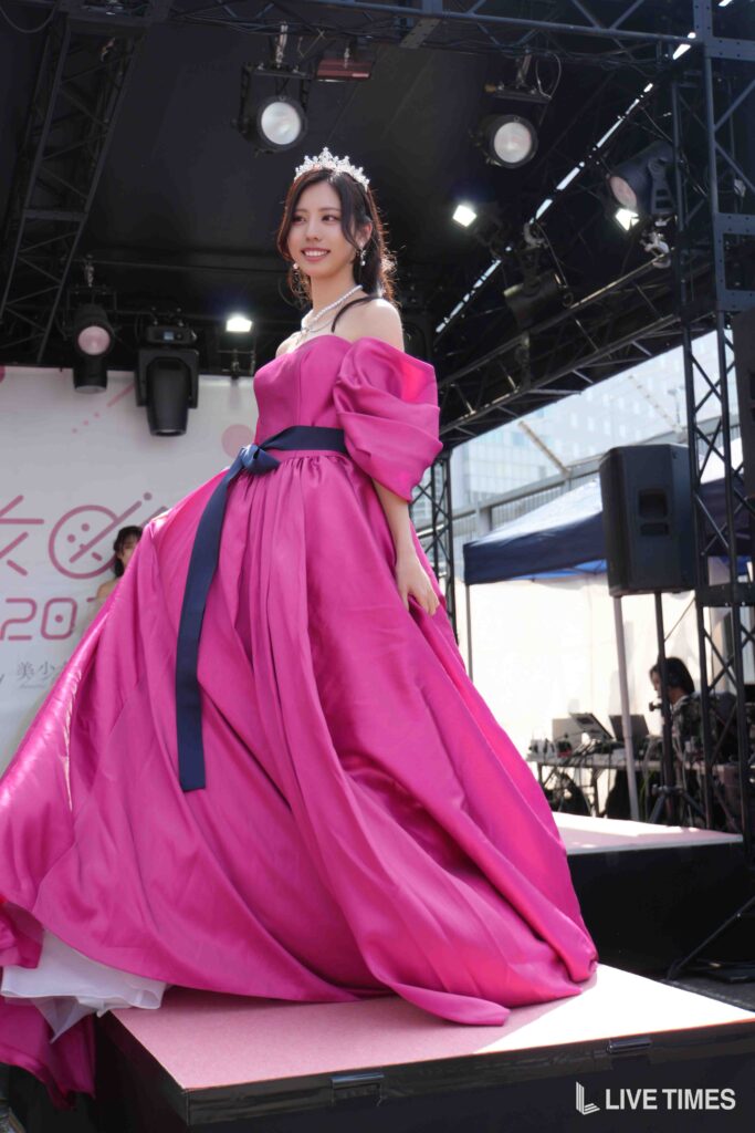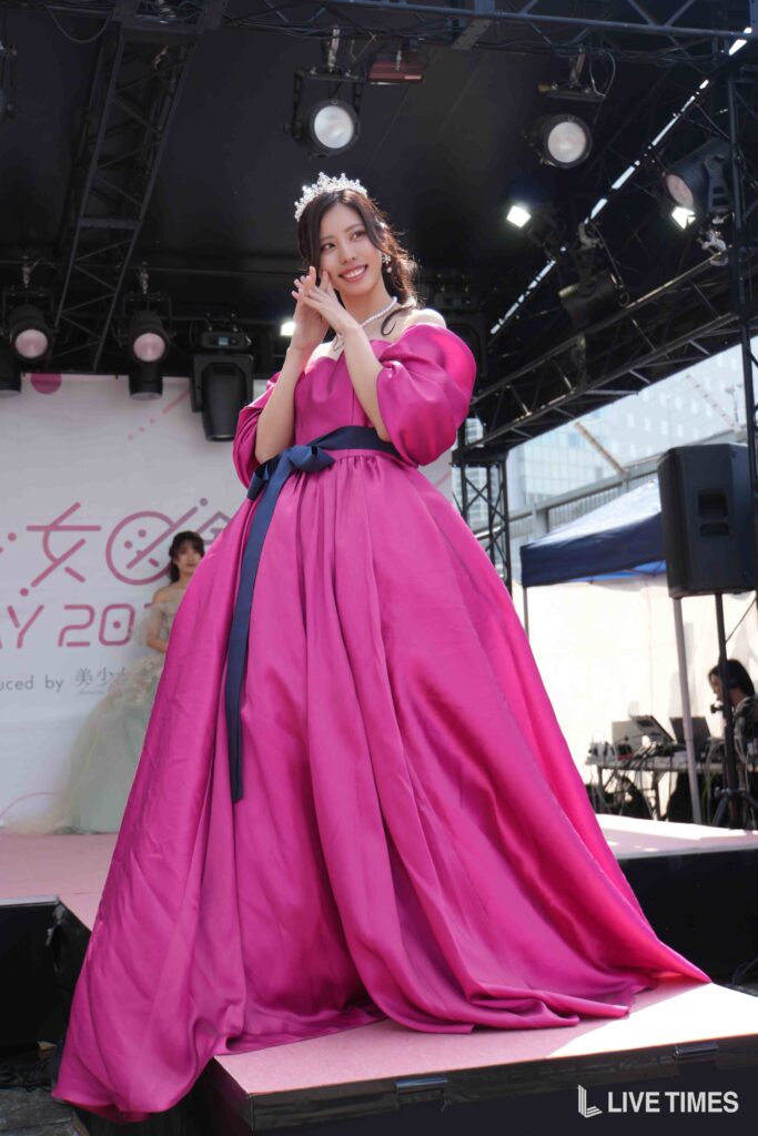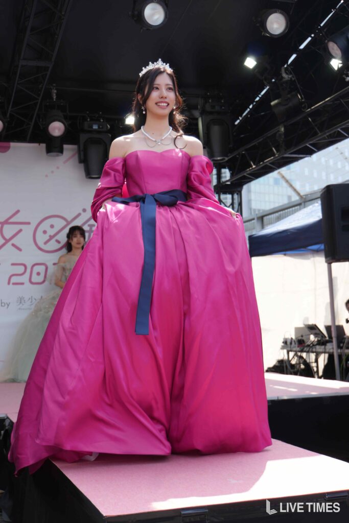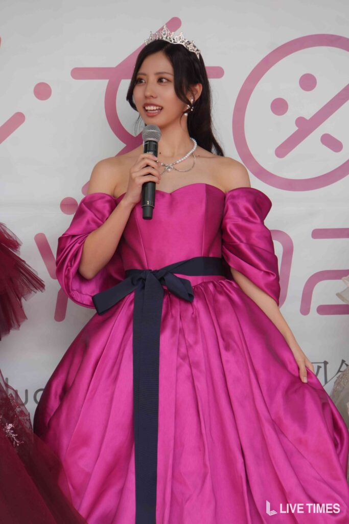 高田は、ウエディングドレスブランド「KURAUDIA」のピンクのドレスにティアラを添えた装いでランウェイに登場。デコルテが映えるドレスラインで、会場の視線を集めた。
