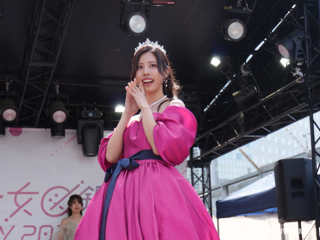 高田は、ウエディングドレスブランド「KURAUDIA」のピンクのドレスにティアラを添えた装いでランウェイに登場。デコルテが映えるドレスラインで、会場の視線を集めた。
