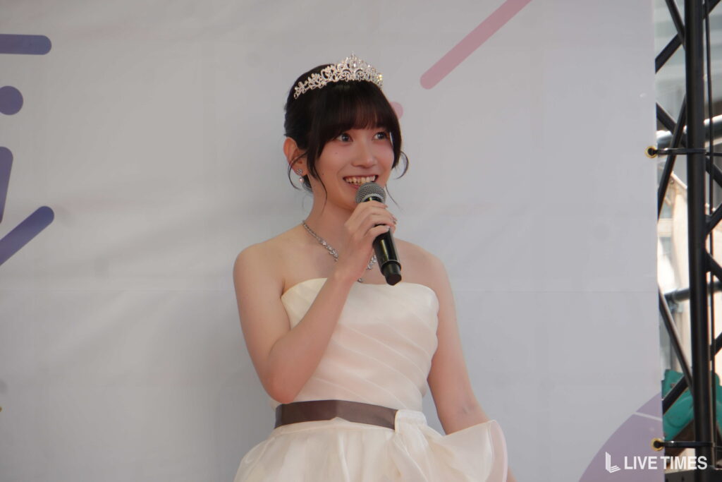 蒼月は、ウエディングドレスブランド「KURAUDIA」の純白のドレスに煌びやかなティアラを合わせた装いでランウェイに登場。デコルテが美しく映えるオフショルダーのドレスラインが目を引いた。ランウェイのトップでは客席に向かって手を振り、投げキスのポーズを見せるなど、笑顔あふれるウォーキングで会場を沸かせた。