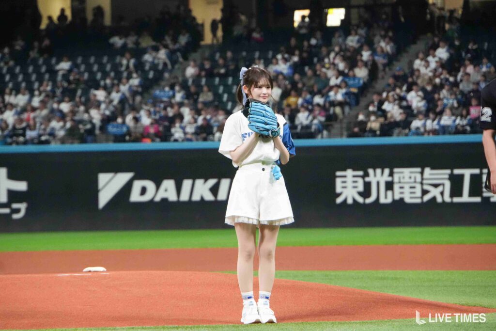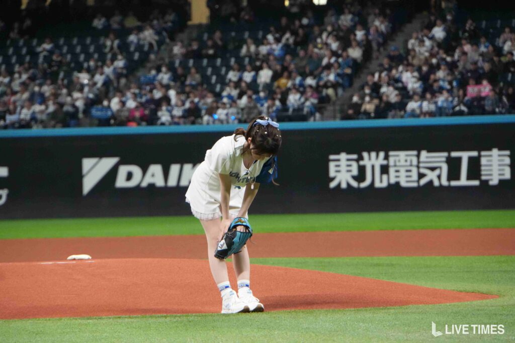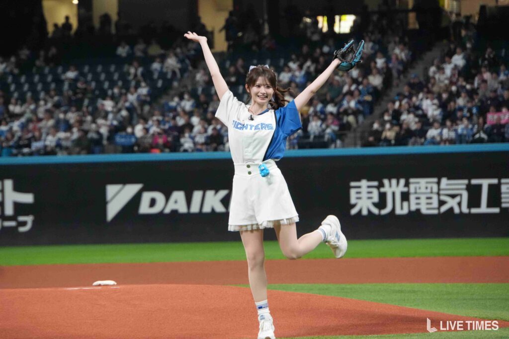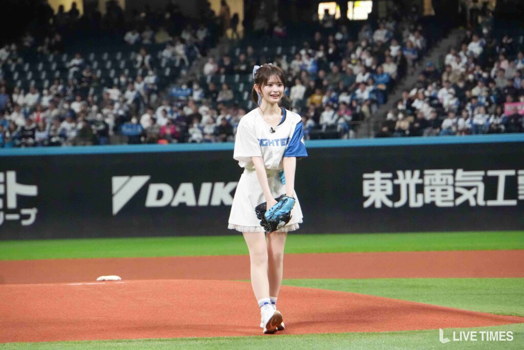 ひみぃはファイターズのホームユニフォームに白のショートパンツを合わせた衣装でマウンドに登場。大きく振りかぶったフォームから放たれたボールはワンバウンドしたものの、まっすぐキャッチャーのミットへ届いた。