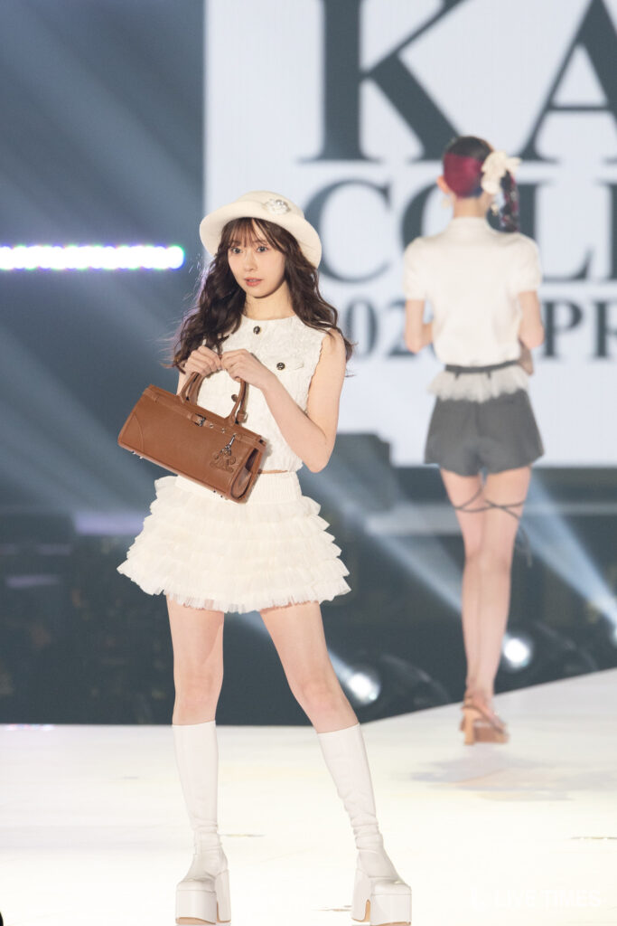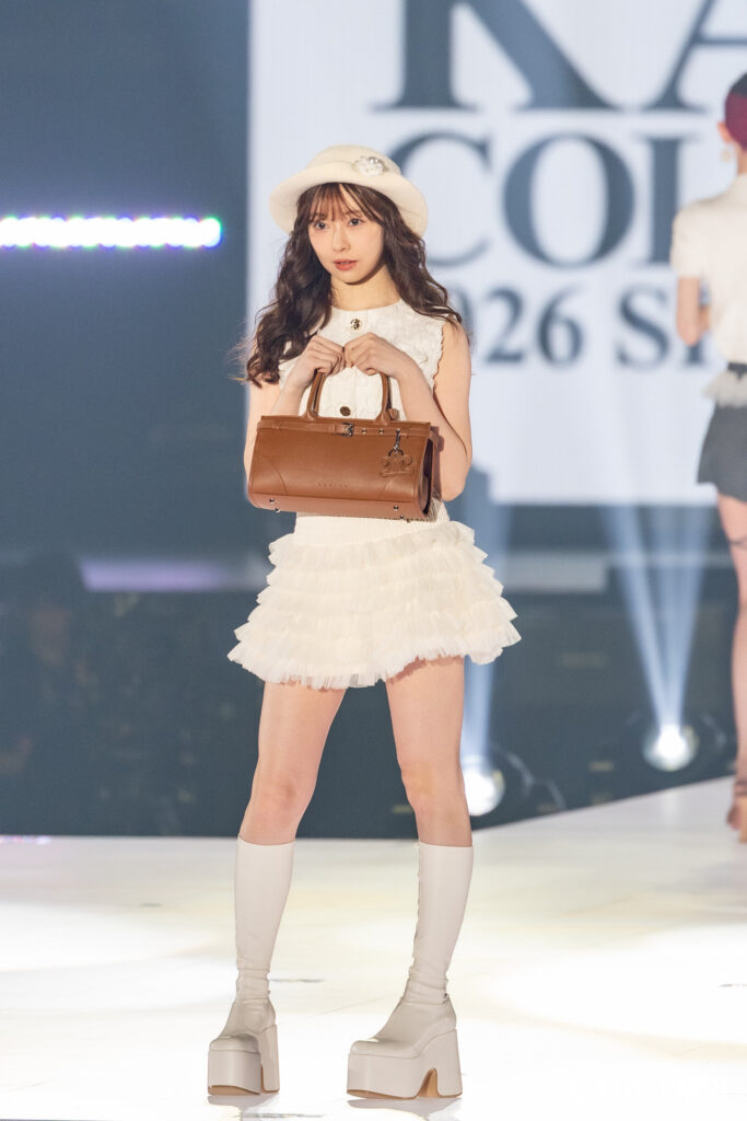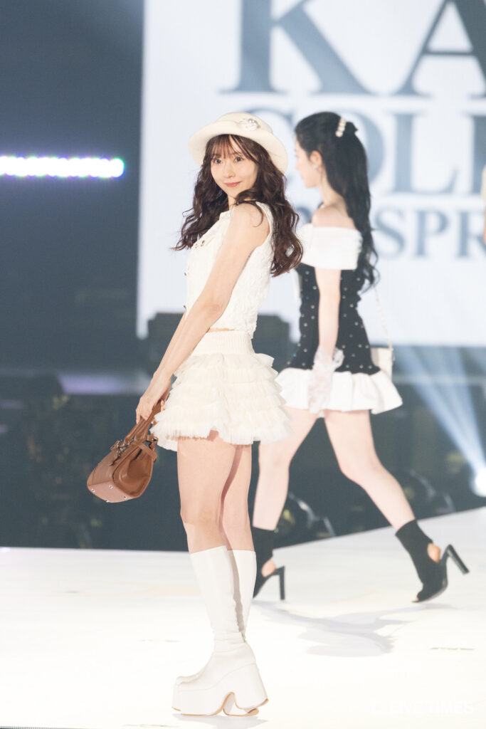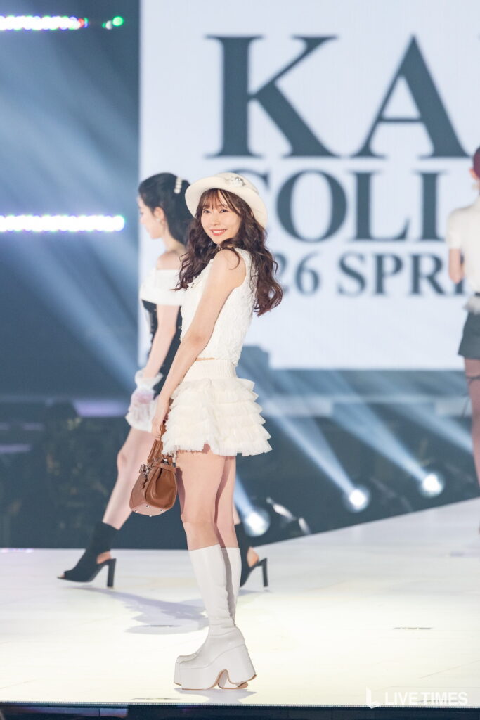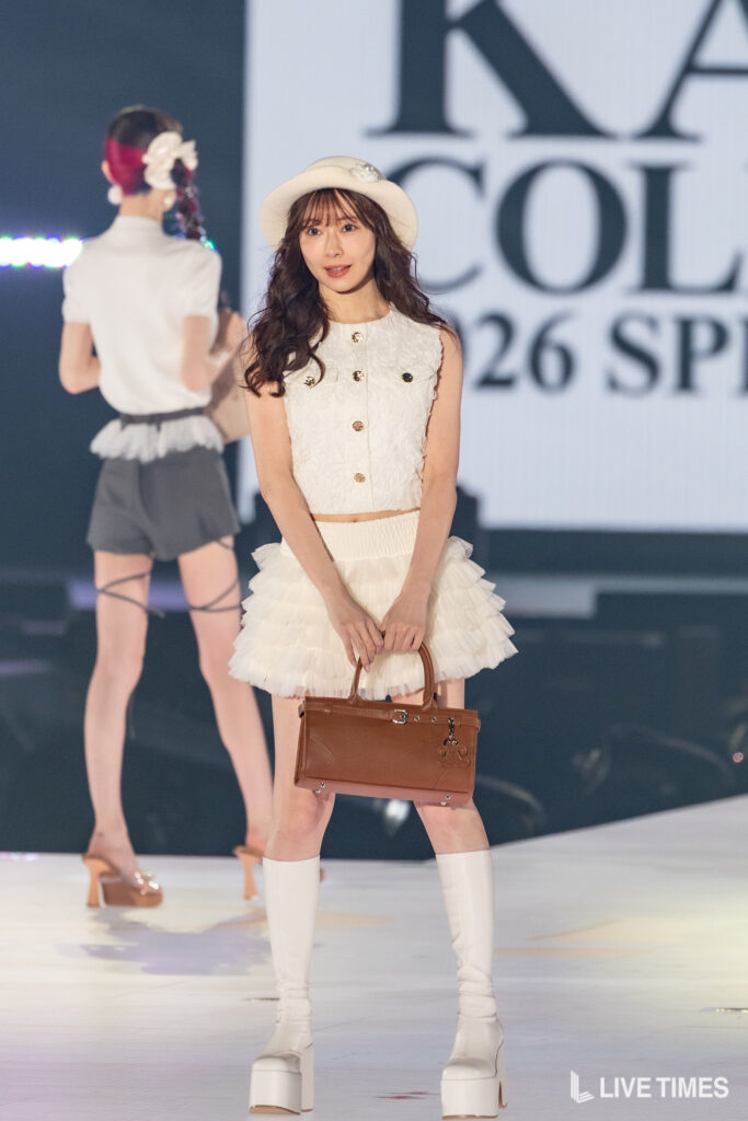 渡辺美優紀は、「Darich」のFASHION STAGEに登場。白のノースリーブトップスに、フリルのミニスカートを合わせた上品な肌見せスタイルで登場した。純白のコーディネートが透明感のある美肌を引き立て、スカートから伸びるまっすぐな美脚に観客の視線が釘付けに。ハットとブラウンのハンドバッグが全体のアクセントとなり、上品さと可愛らしさを兼ね備えた着こなしを披露した。ランウェイのトップでは柔らかな笑顔を見せ、華やかな存在感を放った。