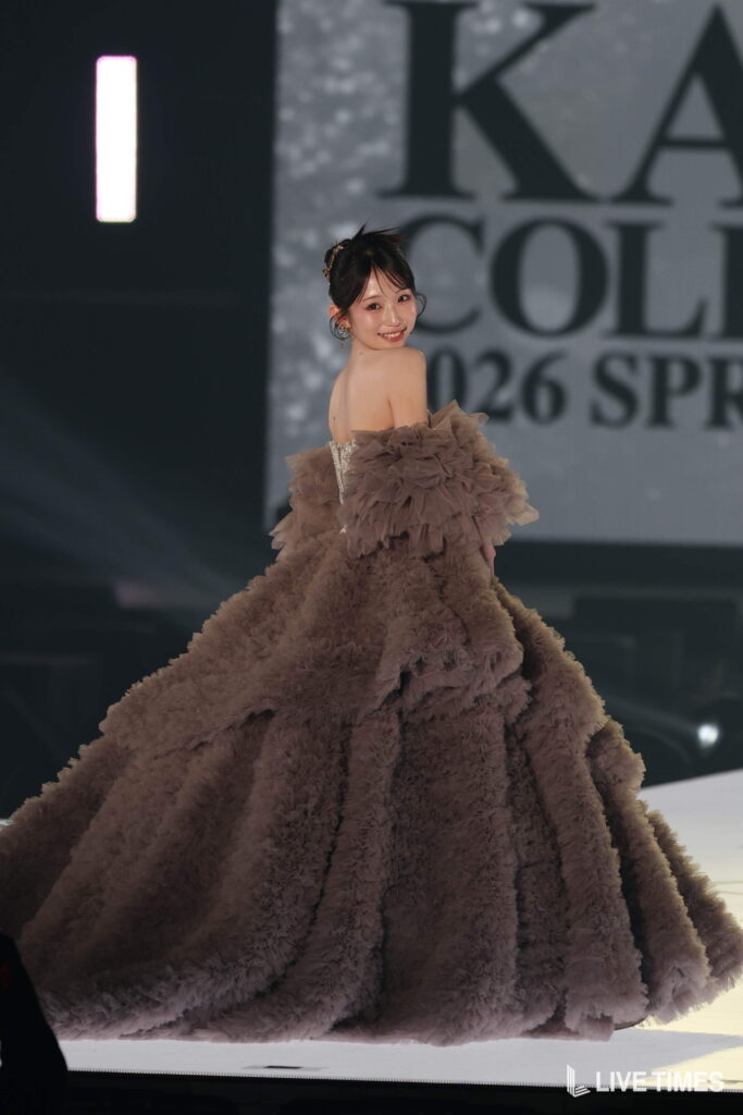 まやは、「ISAMU MORITA BRIDE スペシャルステージ supported by 17LIVE」に登場。チュールがふんだんにあしらわれたブラウンのオフショルダーのドレスで姿を見せた。胸元の装飾と大胆に広がるボリュームたっぷりのスカートが優雅な世界観を演出し、美しいデコルテと相まって会場の視線を一身に集めた。ランウェイのトップでは、頬に手を添える上品なポーズや柔らかな笑顔を見せ、ブライダルドレスの世界観を体現した。