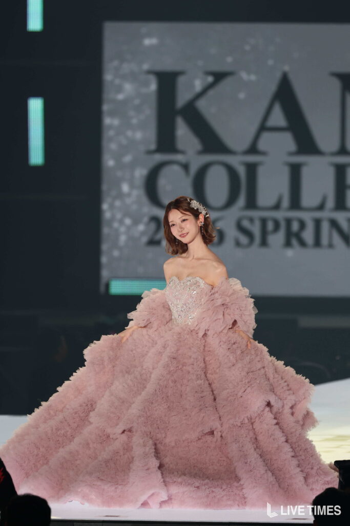 胸元に施されたビジュー装飾と、幾重にも重なるボリューム感のあるスカートが華やかな世界観を演出。美しいデコルテとシャープな肩ラインが際立ち、会場の視線を一身に集めた。ランウェイでは頬に手を添える上品なポーズや、観客へ向けた柔らかな笑顔を見せ、プリンセスのような世界観を体現した。