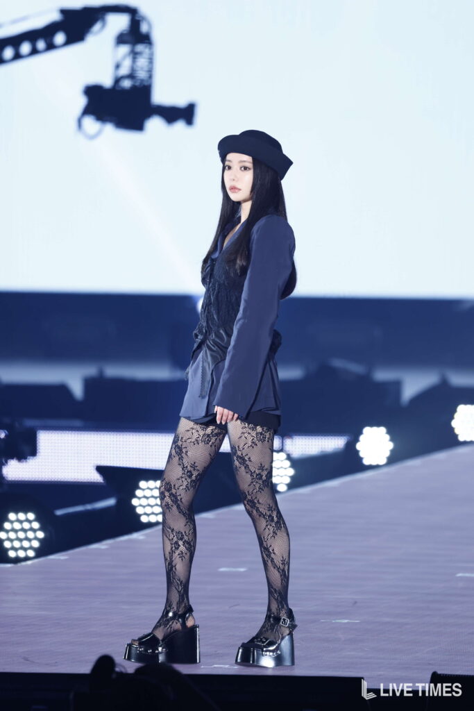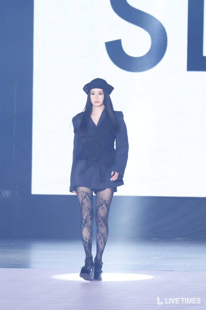 なごみは、「SLY」のステージに登場。ネイビーのシャツにブラックレースのビスチェを重ねたレイヤードトップスに、フラワーレースのシアータイツとブラックの厚底バックルシューズを合わせたダークモードなスタイルで登場した。ブラックのバケットハットがクールなアクセントとなり、シアータイツ越しに覗く脚線美が観客の視線を釘付けにした。