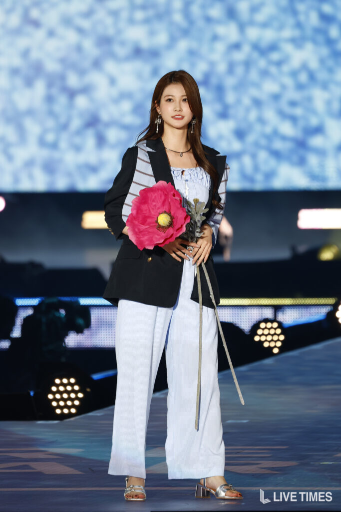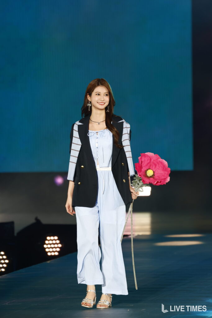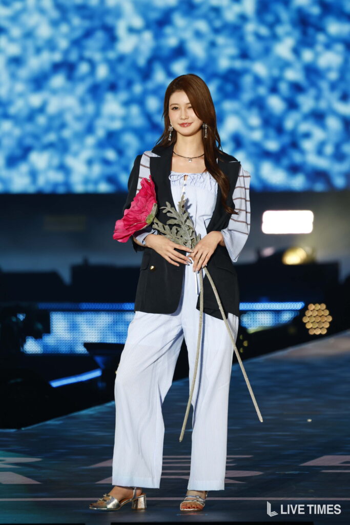生見愛瑠は、「FREE’S MART」のステージにトップバッターで登場。淡いブルーのストライプ柄セットアップに、黒のロングジャケットを重ね着したスタイリングで、手には鮮やかなピンクの大輪の造花を携えて登場した。シルバーのヒールサンダルや揺れるピアスが全身を格上げし、フェミニンさと甘辛MIXの絶妙なバランスを表現した春夏らしい装いで観客を魅了。