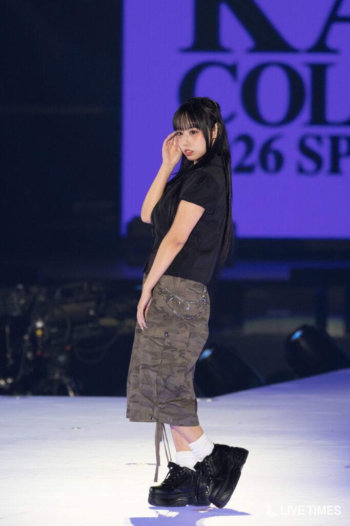 希姫(きき)は、「ミクチャ」のSPECIAL STAGEに登場。ブラックのパフスリーブトップスにカモフラ柄のカーゴスカート、厚底シューズを合わせたSPINNSのストリートスタイルで姿を見せた。ランウェイのトップでは、クールな表情から遠くを見つめるアンニュイな眼差し、そして一転してにっこりとした笑顔を見せ、多彩な表情で観客を魅了した。