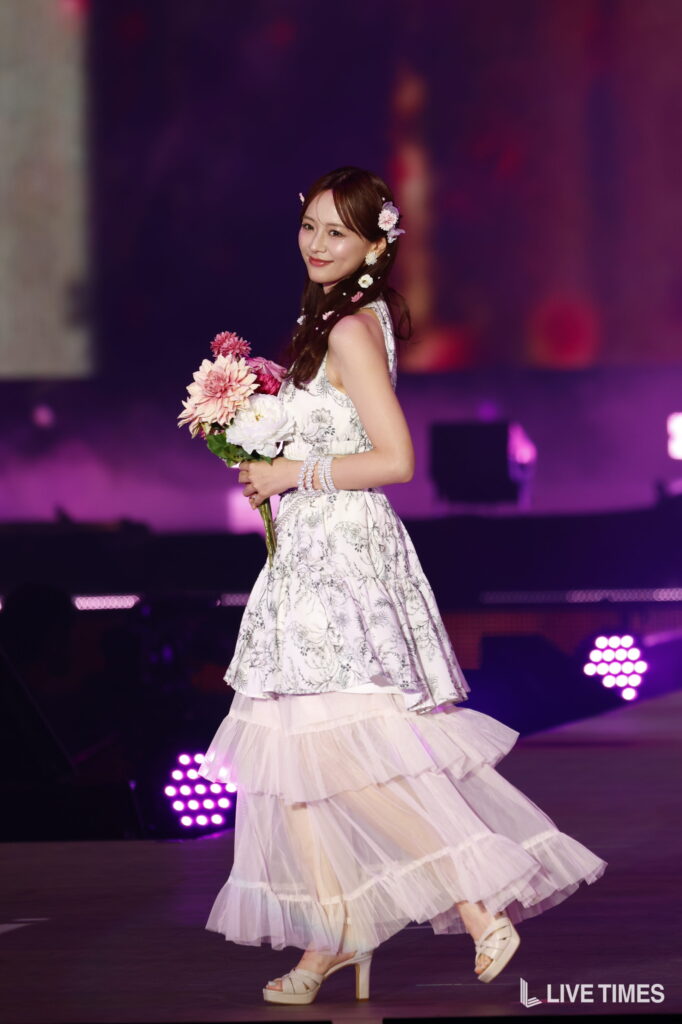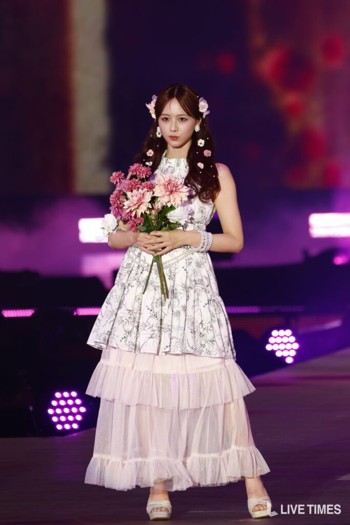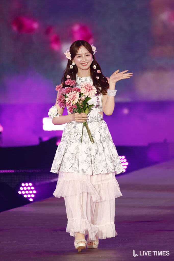 ランウェイに登場した森は、ノースリーブの花柄ワンピースに薄ピンクのチュールスカートを合わせたコーデで登場。ノースリーブから覗く透明感あふれる美肌が際立ち、髪にも花をあしらって華やかなランウェイを披露した。