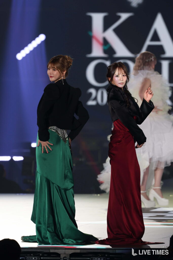 ランウェイのトップでは、腰に手を添える凛としたポーズや、口元に人差し指を添えるチャーミングな仕草を披露し、対照的な二人の魅力で会場の視線を集めた。
