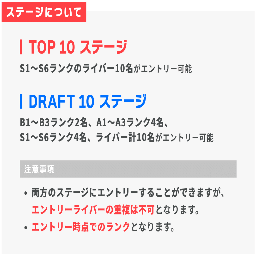 B1〜B3ランクのライバー2名、A1〜A3ランクのライバー4名、S1〜S6ランクのライバー4名の合計10名のエントリーになります。