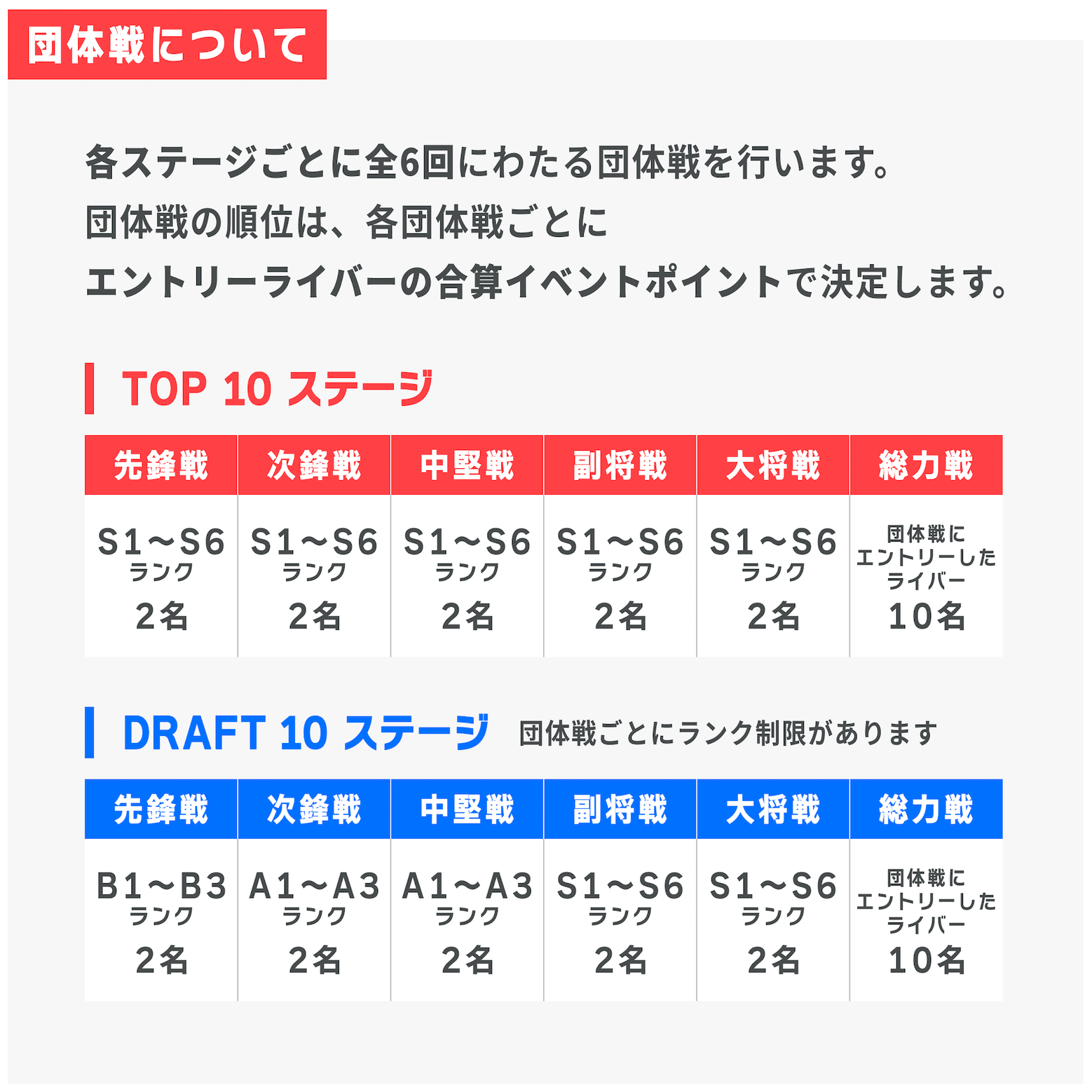 例えば、TOP 10 ステージの先鋒戦はS1〜S6ランク2名のイベントポイントの合算で順位が決定します。