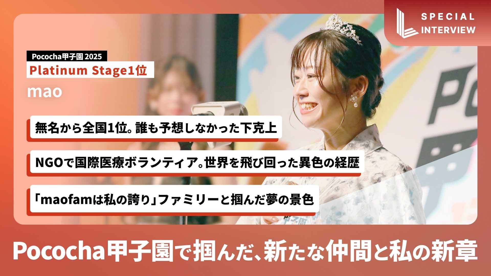 ノーマークの無名だった私が、Pococha甲子園のPlatinum Stage“初代全国王者”になれたことは、私自身が一番驚いています。だからこそ、応援してくださった皆さんも、ファミリーの皆さんも、自信を持って「mao fam」を誇ってほしいです。