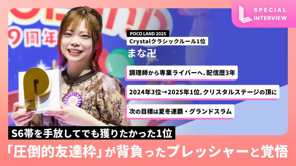 国内最大級のライブ配信アプリ「Pococha」の年間最大級イベント『POCO LAND 2025』。12月に行われたCelebration PartyでCrystal クラシックルールの頂点に立ったのは、 調理師から専業ライバーへ転身し、配信歴3年でクリスタルステージの頂点に立った「まな卍」だった。