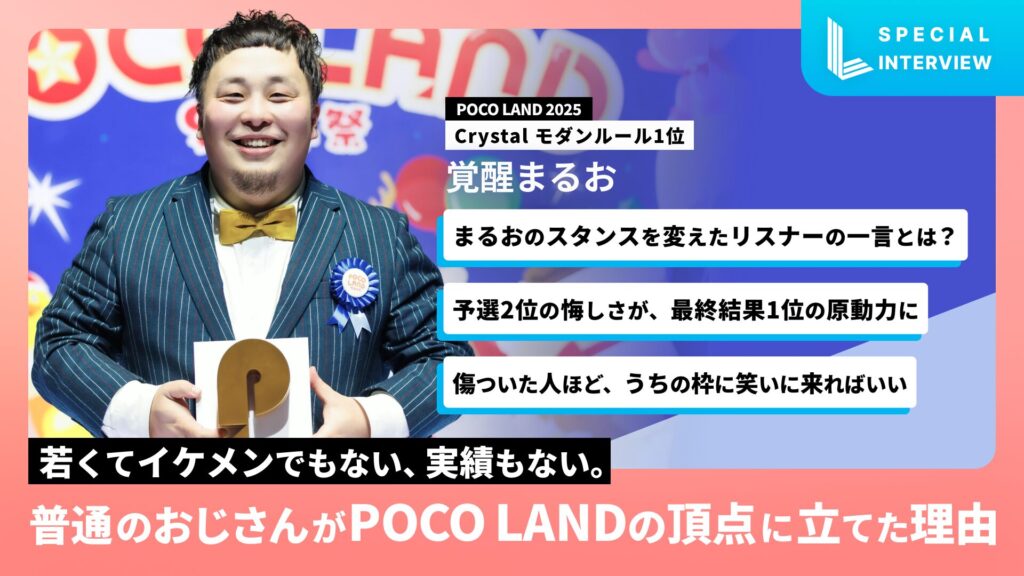 国内最大級のライブ配信アプリ「Pococha」の年間最大級イベント『POCO LAND 2025』。12月に行われたCelebration PartyのCrystal モダンルールの頂点に立ったのは、元芸人の「覚醒まるお」だった。
