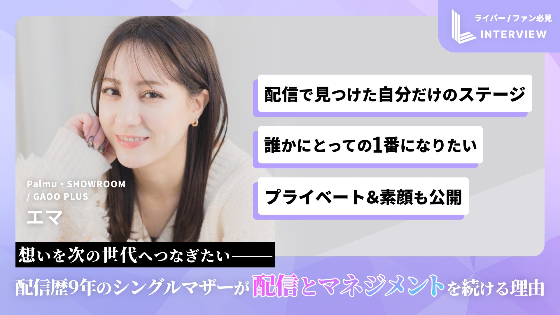現役ライバーはもちろん、これからライブ配信を始めたいと考えている人、子育てや仕事と両立しながら新しい一歩を踏み出したい人にとって、ヒントが詰まったインタビューだ。