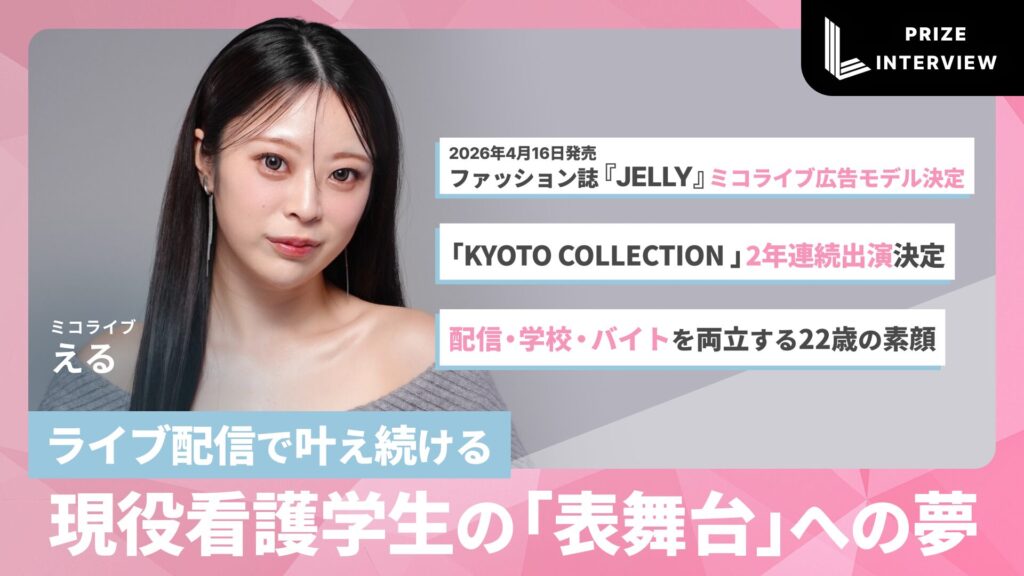 現役看護学生でありながら、ミコライブで活躍する22歳のライバー・える。2025年7月に配信を始めてから、わずか5ヶ月でファッション誌『JELLY』ミコライブ広告モデル、8ヶ月で「KYOTO COLLECTION」2年連続出演決定と、夢を次々と現実にしている注目のライバーだ。学業とアルバイト、そして配信を両立しながら、「表舞台に立ちたい」という想いを一つずつ叶えていく彼女に、雑誌掲載までの道のり、ライブ配信への想い、そしてこれからの夢について語ってもらった。